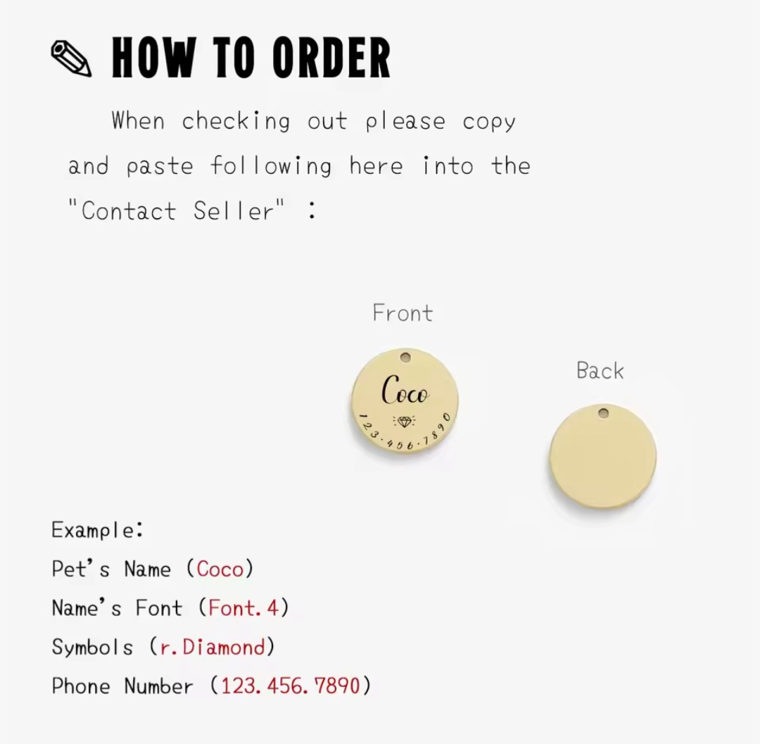 Personalized pet ID tag with custom name, phone number, and fun symbols engraved on the front. Lightweight, durable, and easy to attach to cat or dog collar for everyday safety.
