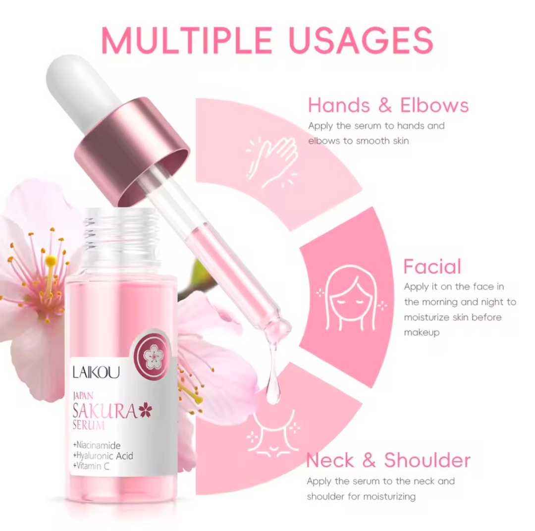 Enhance your skincare routine with LAIKOU Sakura Face Serum, a lightweight essence designed to brighten skin, reduce the appearance of wrinkles, and shrink pores. Enriched with sakura extract, it helps deeply moisturize, improve skin texture, and leave skin smooth, fresh, and radiant. Suitable for daily use and all skin types. Available in 30ml.