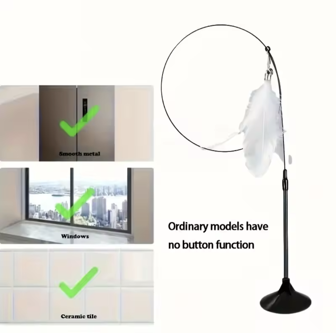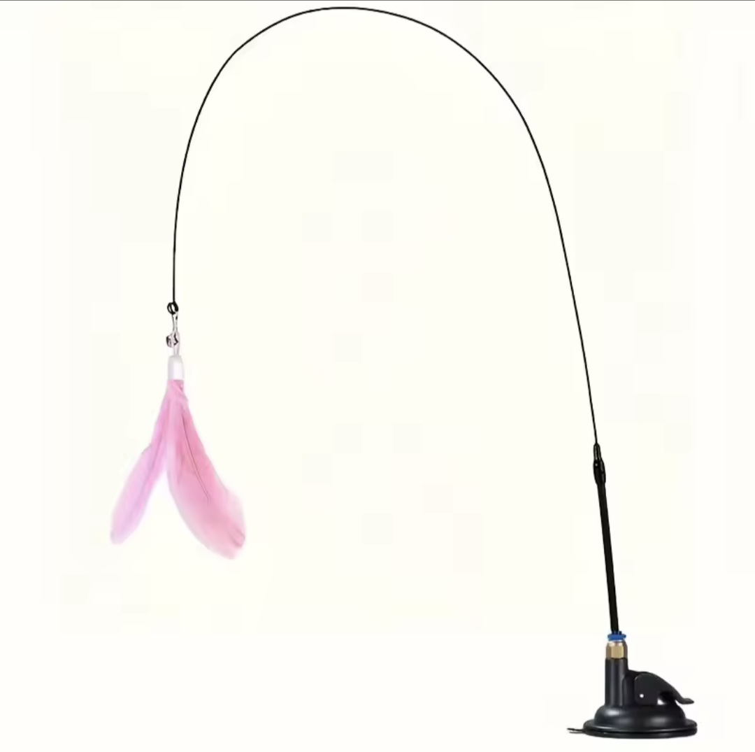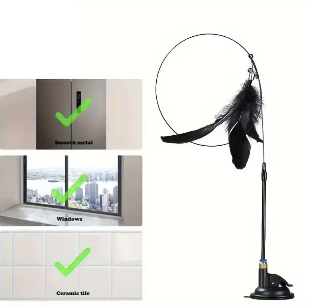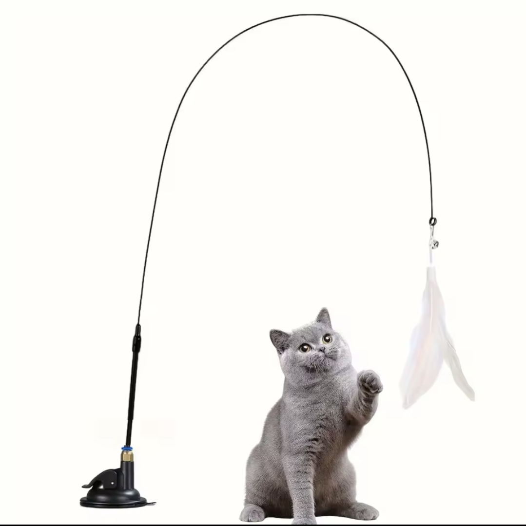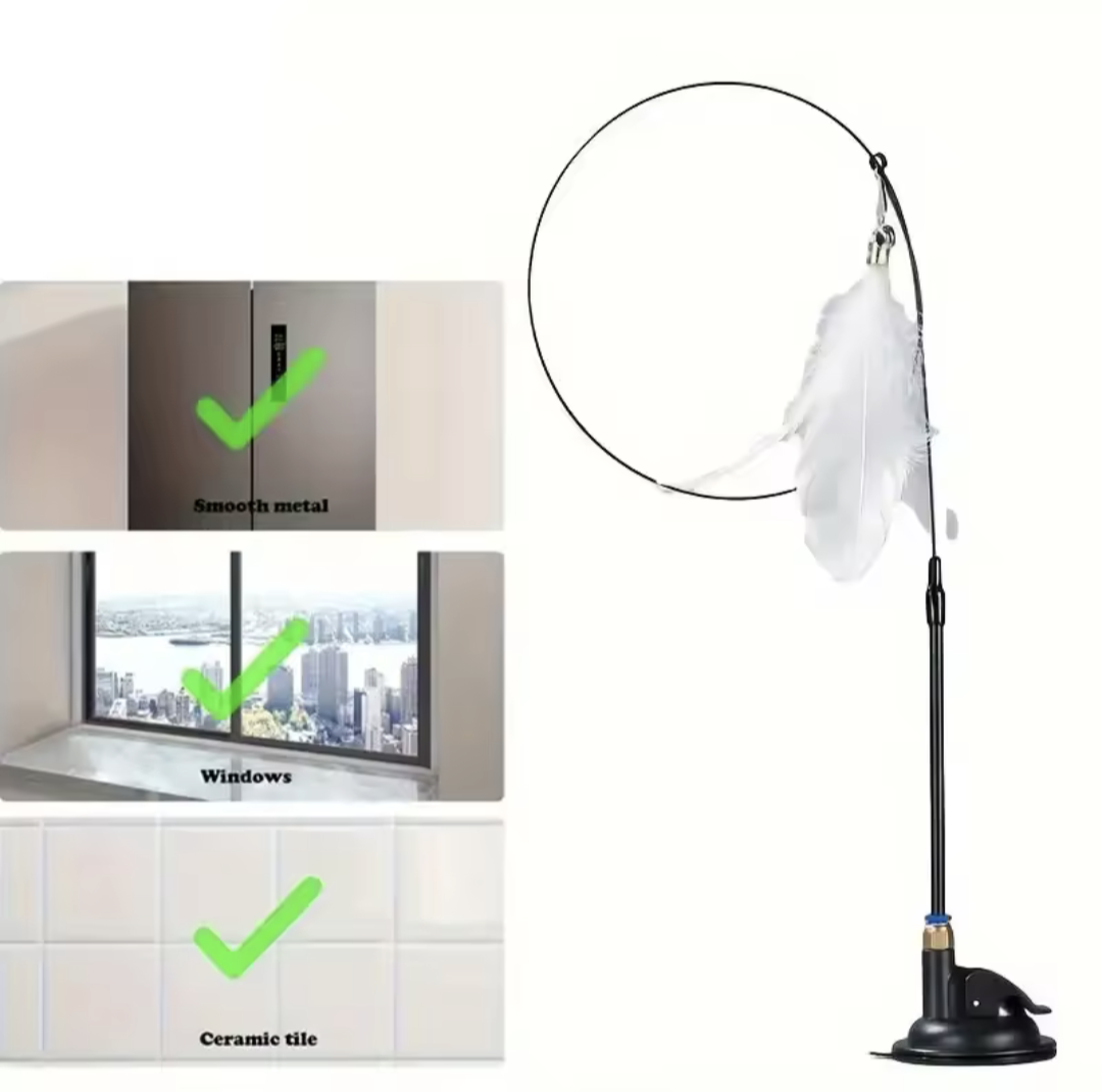 Keep your cat active and entertained with this fun feather wand! Featuring a long suction cup pole, it sticks to smooth surfaces for hands-free play. The bell adds extra excitement—perfect for exercise, hunting instincts, and bonding.