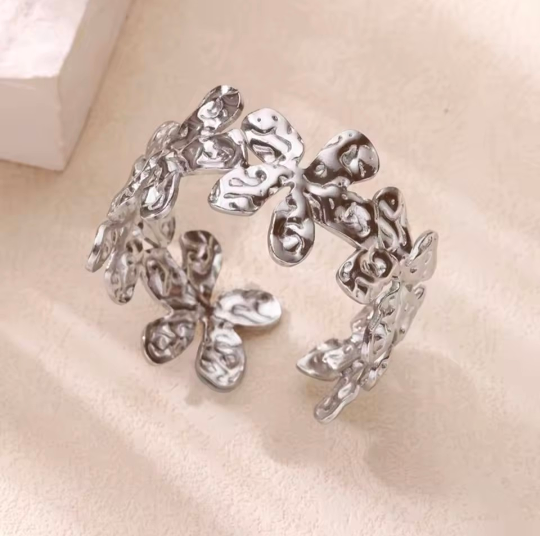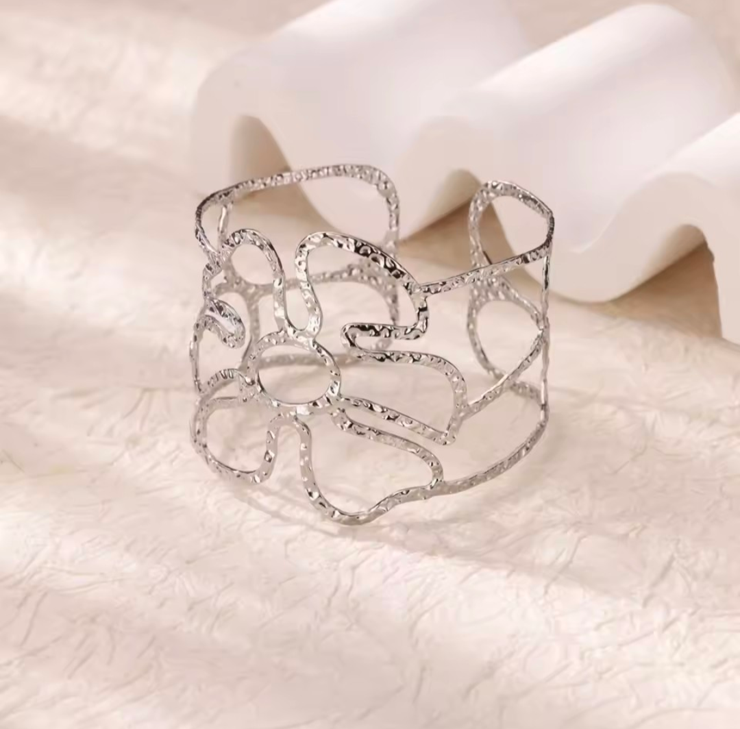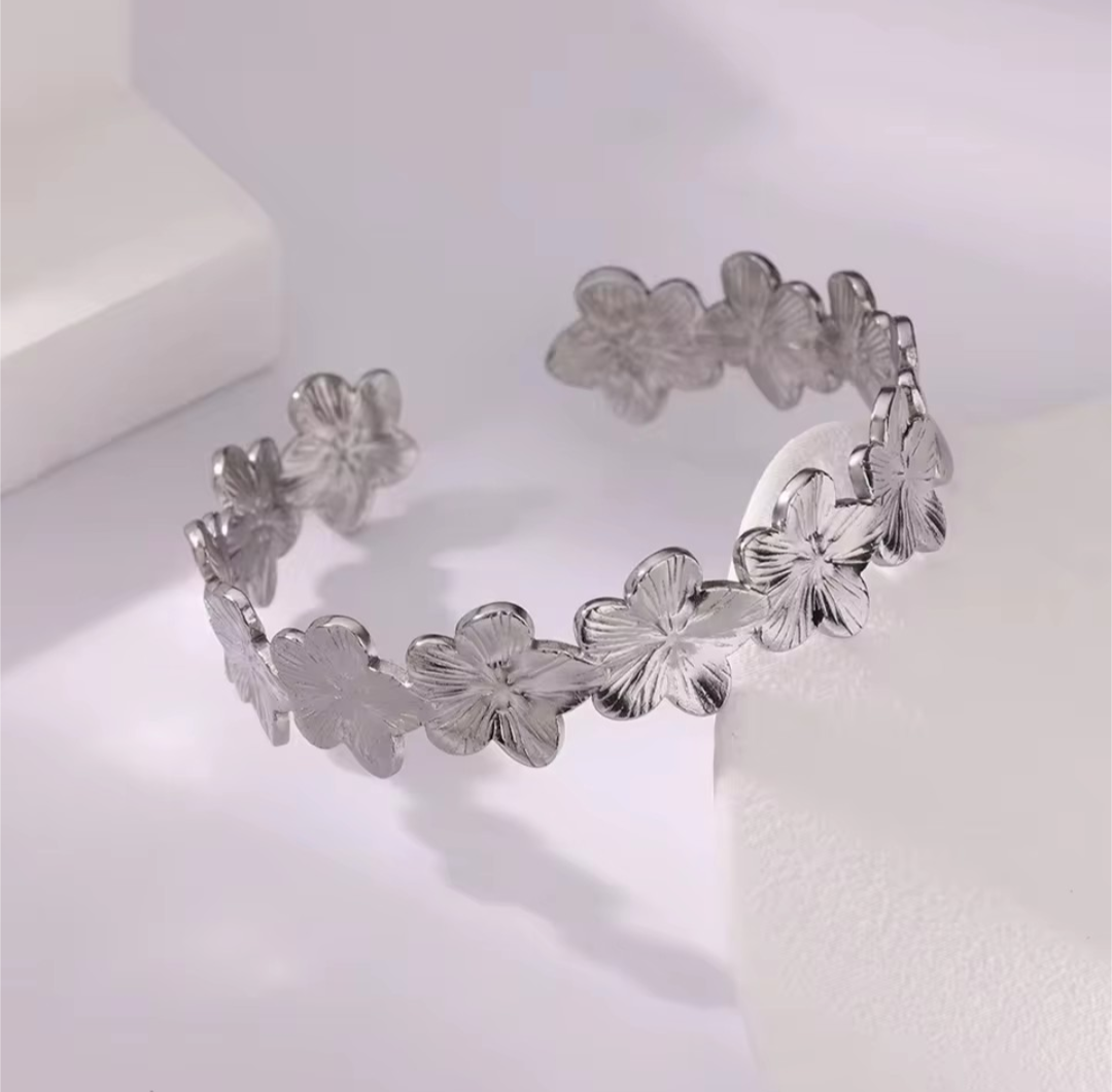 Aesthetic stainless steel bracelet with flower & leaf design. Open, adjustable, lightweight, and perfect for daily wear or gifting.