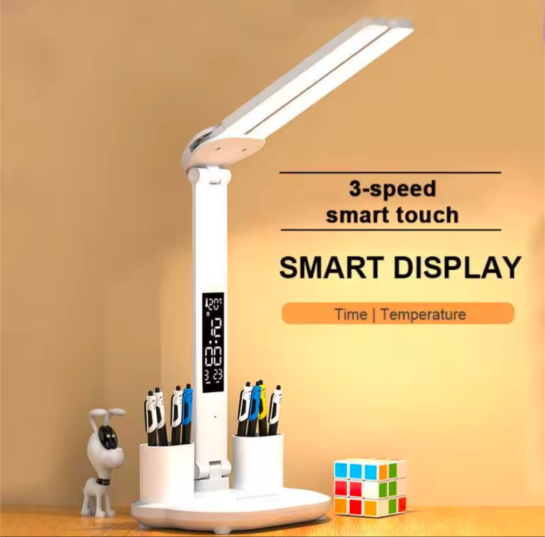 This USB rechargeable LED table lamp features dimmable lighting, a built-in clock, and 2 rotating lamp heads for flexible lighting.